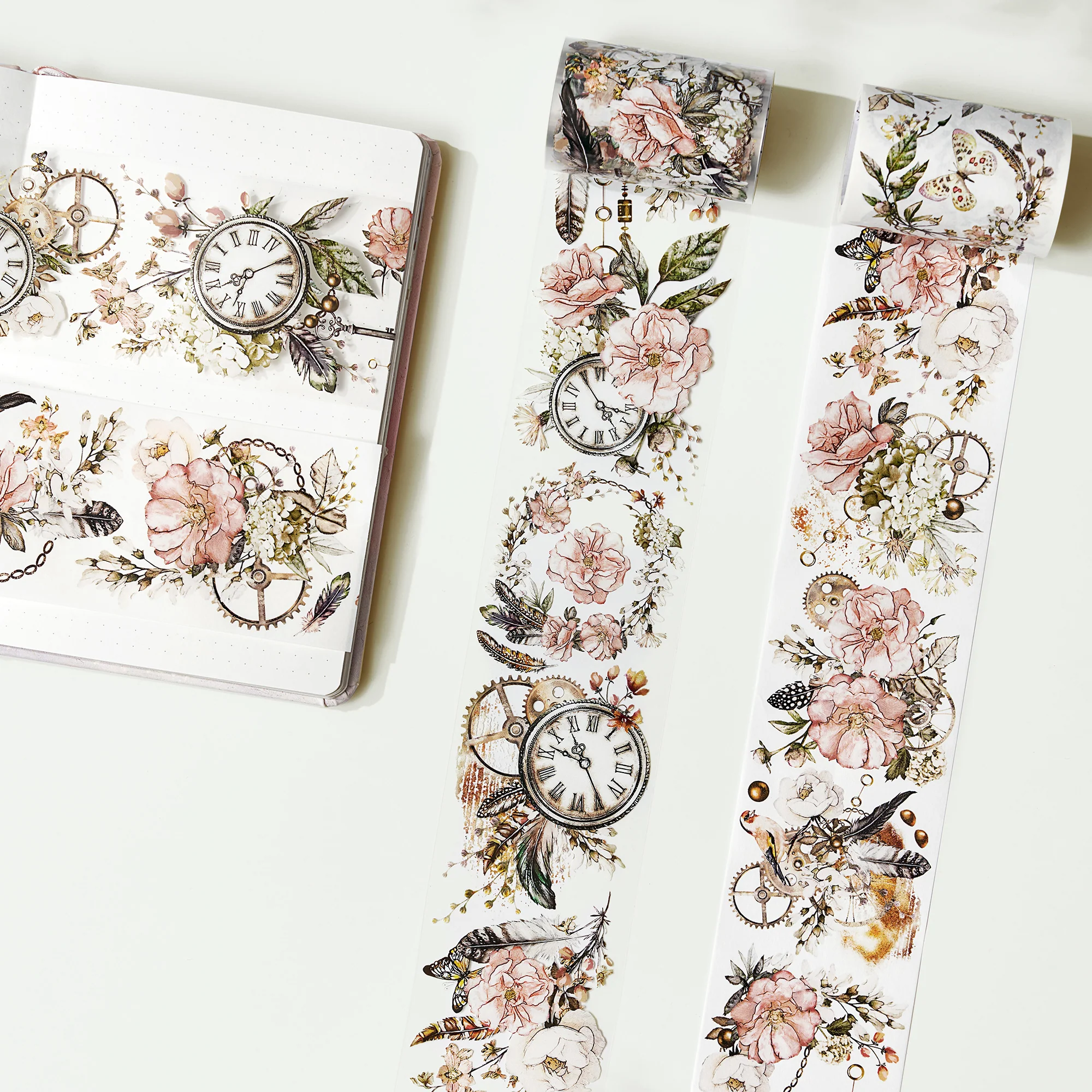 Hey there, crafters and creators! Get ready to infuse your projects with a touch of vintage charm and natural beauty with our Floral Chronicles Washi Tape Set. Featuring an enchanting array of florals, birds, clocks, and butterflies, this collection is your ticket to a journey through creativity! Let the gentle tick-tock of antique clocks add a dash of old-world allure to your crafts. With each piece, you'll feel like you've stepped back in time to a more elegant era.